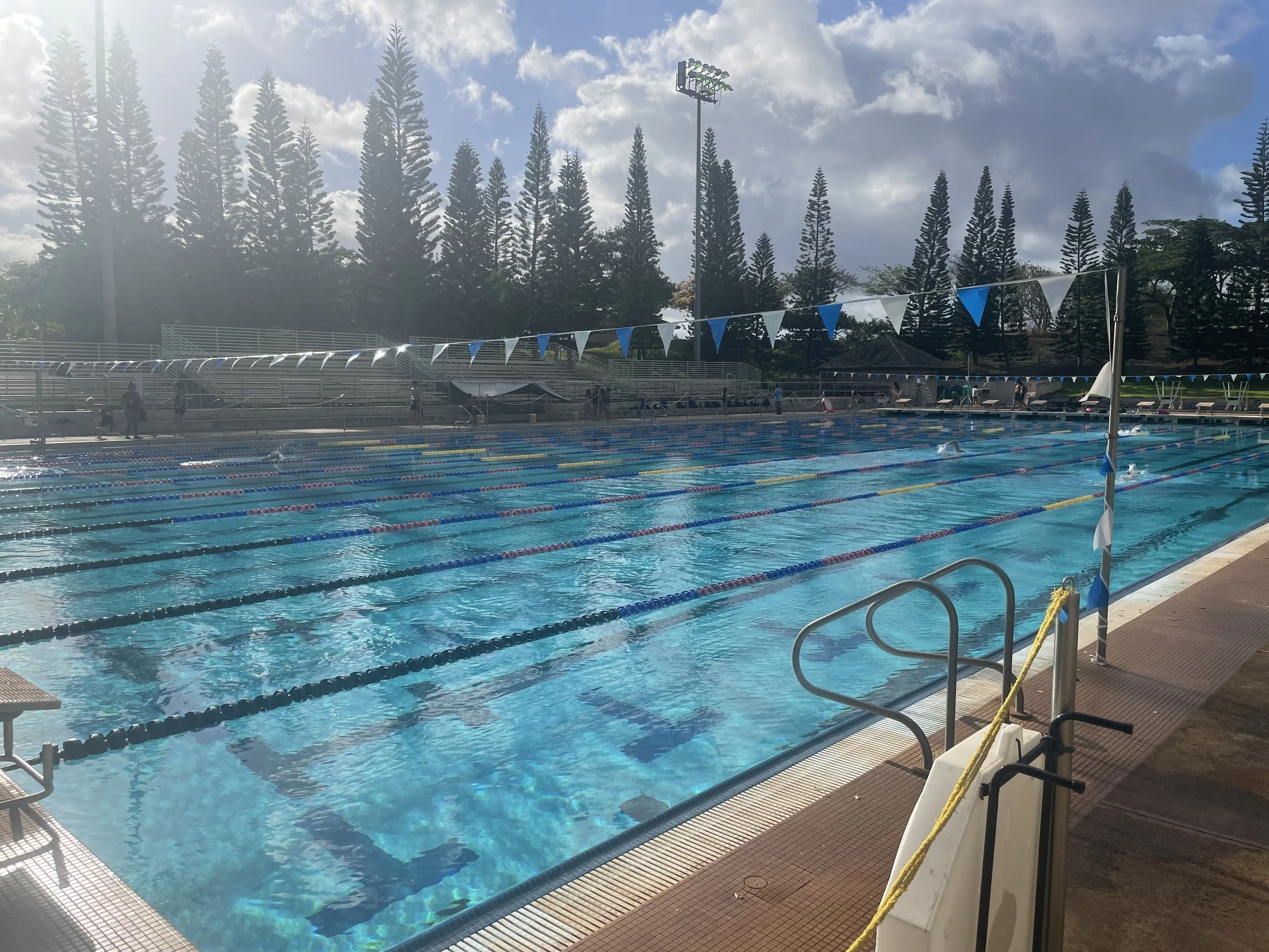 Our home pool for all levels is at the K. Mark Takai Veterans Memorial Aquatic Center in Waipi’o. This pool has a diving well with multiple boards and changes between 10 lanes - 25 yards with 16 lanes - 25 meters during short coarse season and 10 lanes - 50 meters during long course season.
